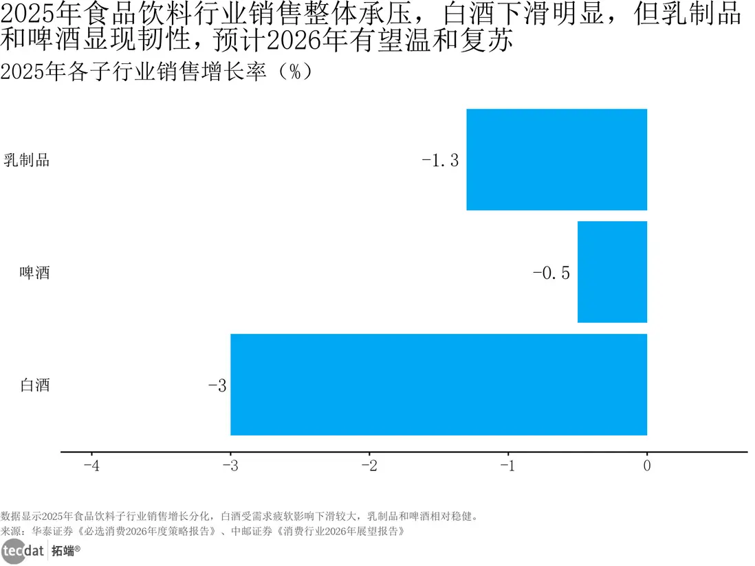 3秒解讀:白酒受場景受限、庫存高企影響下滑明顯,乳製品、啤酒的剛性需求成為“抗跌利器”。