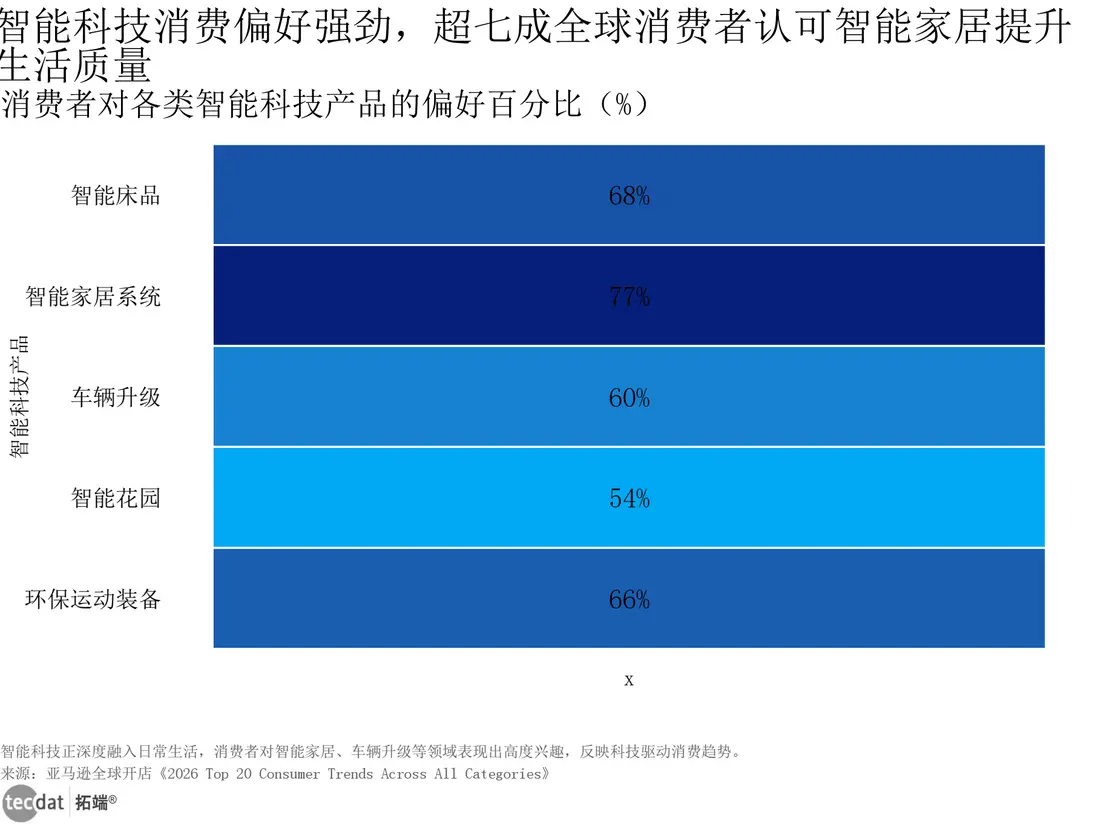 智能科技正從“概念”走向“落地”,深度融入日常生活。消費者對智能家居系統的偏好度高達77%,智能牀品、環保運動裝備、車輛升級、智能花園的偏好比例也分別達到68%、66%、60%和54%。這背後不是“技術崇拜”,而是AI與IoT技術讓產品從“功能滿足”升級為“體驗優化”——比如智能家居系統可實現“回家自動開燈、温度自動調節”的場景化聯動,智能穿戴設備能提供“個性化健康監測”服務。