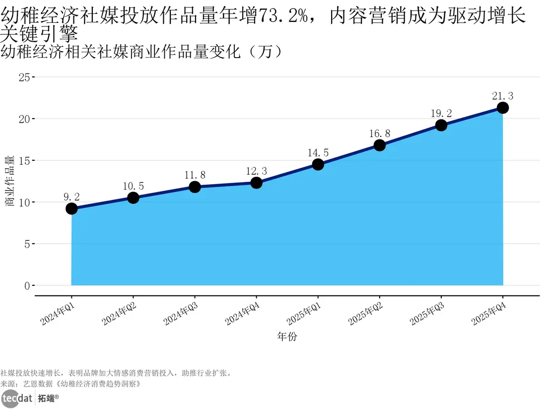 幼稚經濟的增長還體現在“社媒營銷的爆發式投入”上:2025年相關社媒商業作品量達到21.3萬,較2024年的12.3萬增長73.2%,從季度數據來看,作品量從2024年Q1的9.2萬逐步增長至2025年Q4的21.3萬,呈現持續上升趨勢。這反映出品牌對這一賽道的重視程度不斷提升,社媒成為觸達目標人羣的核心渠道。