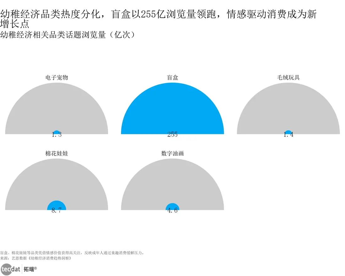 幼稚經濟作為“情感消費”的核心賽道,正在上演“現象級增長”。盲盒以255億次的話題瀏覽量領跑品類,棉花娃娃、數字油畫、電子寵物、毛絨玩具的瀏覽量分別達到8.7億次、4.6億次、1.3億次和1.4億次。這不是“孩子氣的狂歡”,而是成年人通過童趣消費緩解壓力、尋求社交認同的需求釋放——尤其是Z世代,將這類產品視為“自我表達的載體”,願意為情感價值付費。