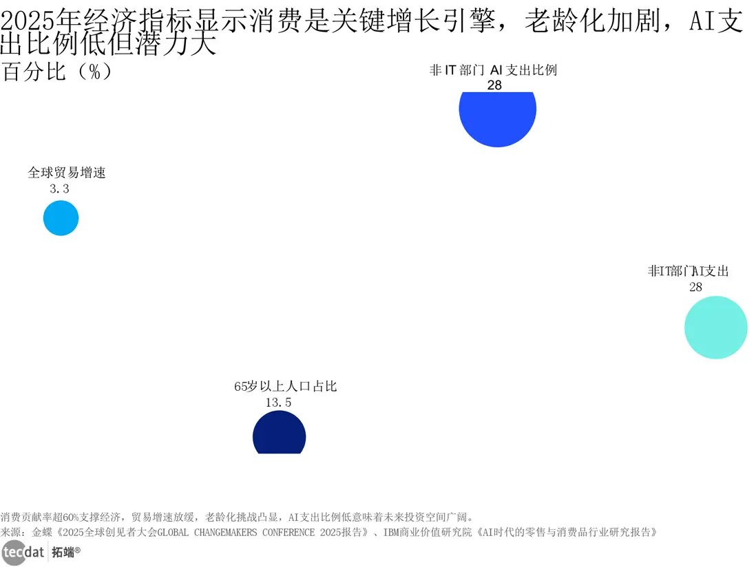從宏觀經濟指標來看,消費對GDP貢獻率達到60%,成為經濟增長的“核心引擎”;全球貿易增速為3.3%,增速相對放緩;65歲以上人口占比13.5%,老齡化加劇帶來新的消費需求;非IT部門AI支出比例為28%,AI投資仍有較大提升空間。這些指標共同勾勒出消費行業發展的“宏觀背景”:消費是經濟核心驅動力,老齡化、AI技術將成為未來消費增長的重要變量。