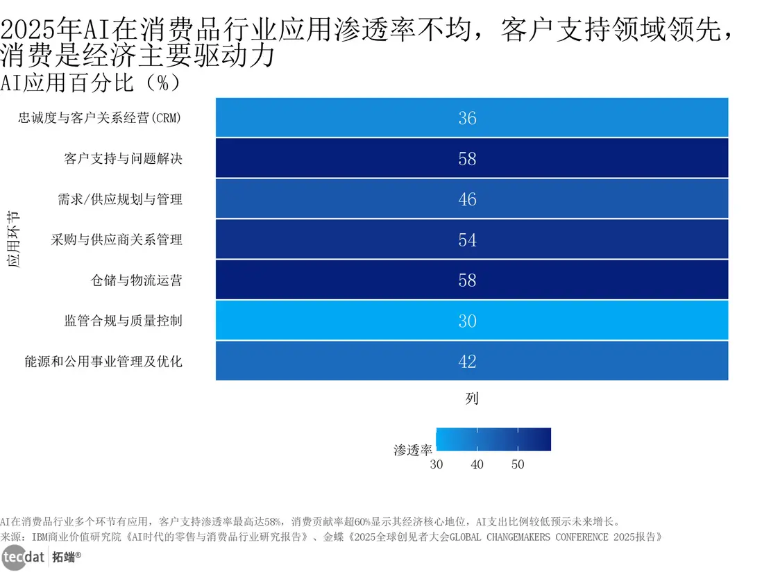 AI技術在消費品行業的應用正在“逐步深化”,從輔助工具升級為“核心生產力”。客户支持與問題解決、倉儲與物流運營的滲透率均達到58%,採購與供應商關係管理、需求/供應規劃與管理的滲透率分別為54%和46%,忠誠度與客户關係經營、能源和公用事業管理及優化、監管合規與質量控制的滲透率分別為36%、42%和30%。AI技術的核心價值的是“降本增效+優化體驗”——AI客服減少了人力成本,AI物流提升了配送效率,AI需求預測降低了庫存風險。