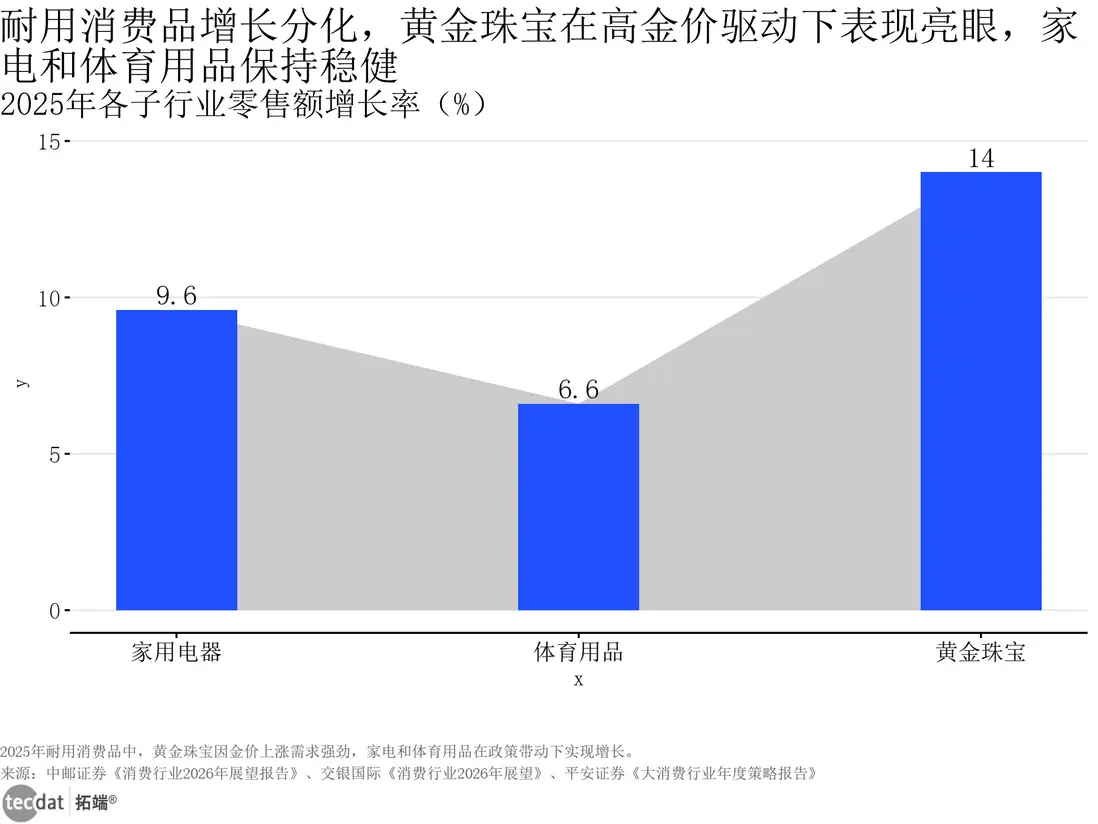 耐用消費品則走出“差異化行情”:黃金珠寶在高金價驅動下零售額暴漲14.0%,成為最大贏家;家用電器和體育用品受“以舊換新”“健康消費”政策刺激,分別實現9.6%和6.6%的增長。這背後是消費者需求的雙重轉變——既追求“資產保值”,也重視“生活品質”。