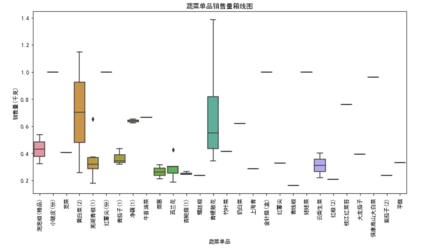 從圖中能直觀看到單品間的銷量差異:部分單品(如雲南生菜、西蘭花)銷量中位數高,且分佈範圍廣,屬於“爆款單品”;而有些單品銷量中位數接近0,且波動極小,屬於“長尾單品”。這種差異源於消費者偏好、烹飪場景等因素——爆款單品多為家常菜常用食材,消費頻次高;長尾單品則可能針對特定消費羣體,需求相對小眾。