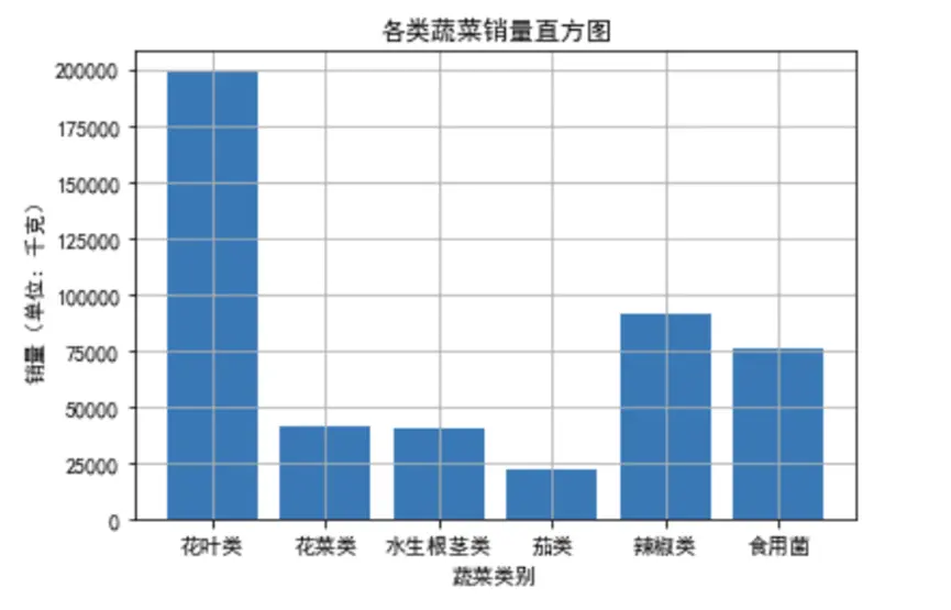 通過統計各蔬菜品類的總銷量並可視化,我們清晰看到不同品類的銷售特徵: