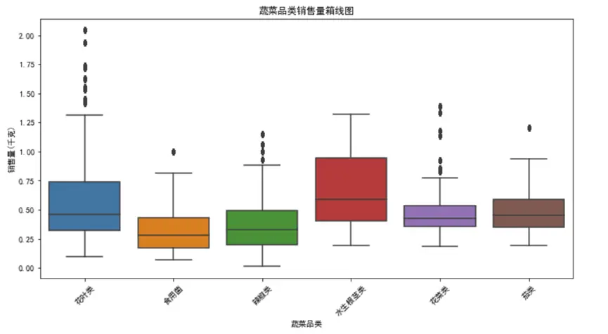 從圖表可以看出,花菜類和花葉類是銷量冠軍梯隊,總銷量顯著高於其他品類,且箱線圖顯示兩者銷量波動較大——這意味着這類蔬菜需求旺盛但不穩定,可能受季節、促銷活動影響明顯。而水生根莖類、茄類和食用菌類銷量相對較低,且箱線圖箱體較窄,説明銷量穩定,需求波動小。