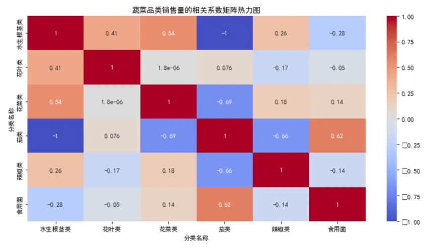- 水生根莖類與花菜類相關係數達0.54,屬於強正相關——這意味着當水生根莖類銷量上升時,花菜類銷量也大概率上升,可能因為兩者常搭配烹飪(如清炒時蔬組合),商超可將這兩類蔬菜就近陳列,促進連帶銷售;