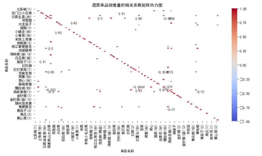 - 強正相關案例:“七彩椒 (1)”與“東門小白 (1)”相關係數接近0.5,兩者可能都是涼拌菜常用食材,消費場景高度重合;