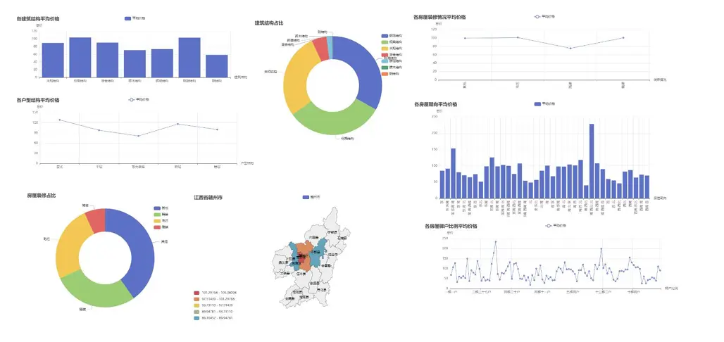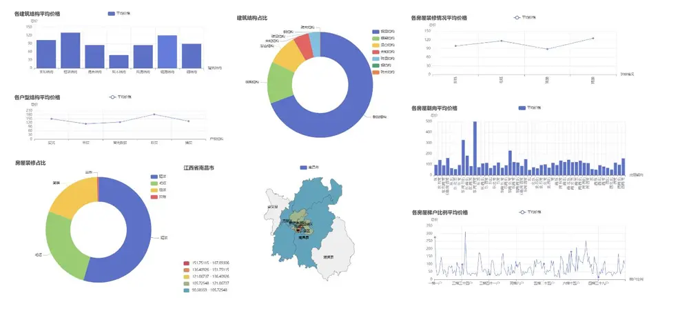 - 數據可視化大屏:整合核心指標(房源數量、均價、户型分佈等),全方位展示市場概況。