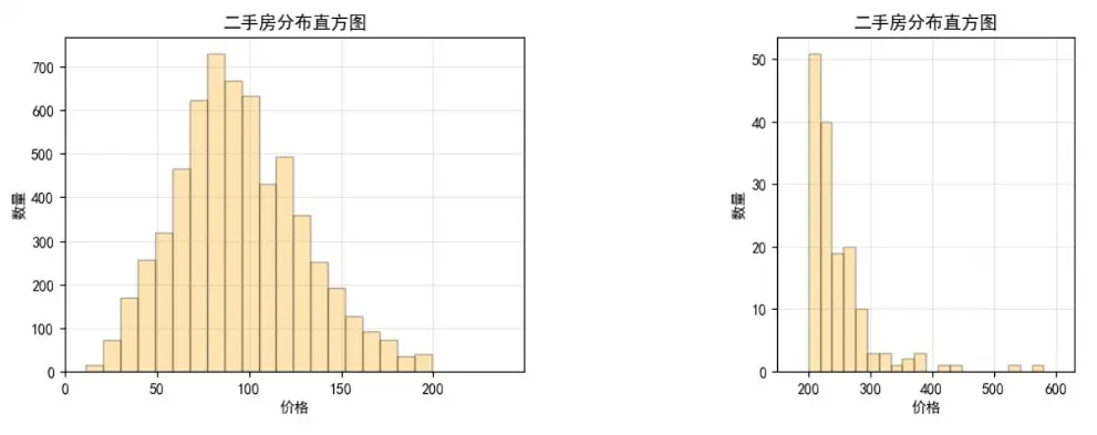 - 房價分佈直方圖:因高價房源佔比極低,分高低價(以1000萬為界)分別展示,更清晰呈現價格集中區間。