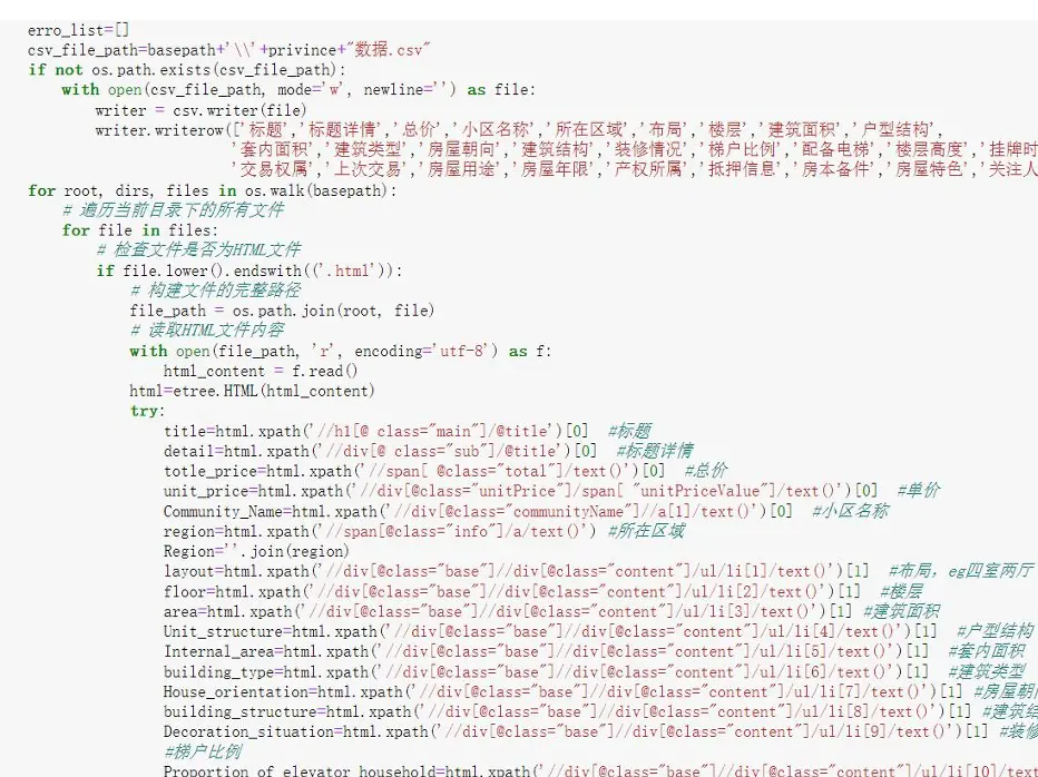 import requestsimport osfrom lxml import etreeimport pandas as pd# 定義爬取函數:參數為城市URL和城市名稱def crawl_city_houses(city_url, city_name): # 創建城市對應的存儲文件夾 city_dir = f'htmls/{city_name}' if not os.path.exists(city_dir): os.makedirs(city_dir) # 請求城市首頁,獲取各區鏈接 response = requests.get(city_url, headers=headers) html = etree.HTML(response.text) area_urls = html.xpath('//div[@data-role="ershoufang"]//a/@href') area_names = html.xpath('//div[@data-role="ershoufang"]//a/text()') # 遍歷各區,爬取分頁數據 for area_url, area_name in zip(area_urls, area_names): area_dir = f'{city_dir}/{area_name}' if not os.path.exists(area_dir): os.makedirs(area_dir)