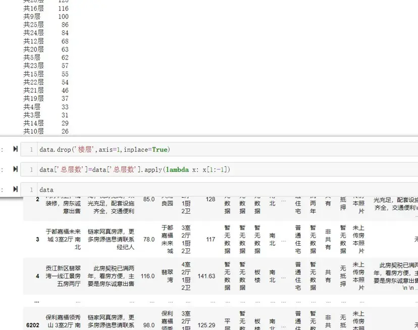 異常值處理:採用IQR法則,剔除總價高於Q3+3IQR的異常數據(主要為深圳高價房源),處理代碼如下。