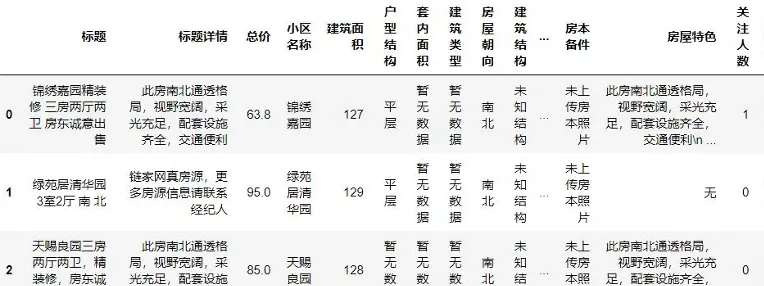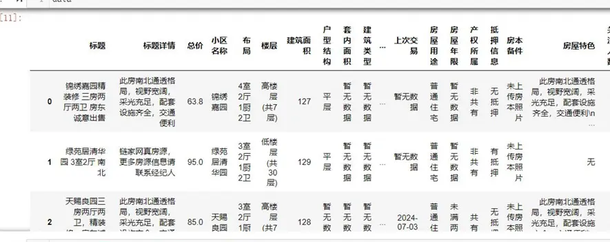 - 數據爬取:通過Python requests庫獲取鏈家平台二手房核心字段,包括房源位置、面積、户型、總價、單價等關鍵信息。