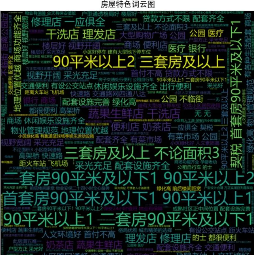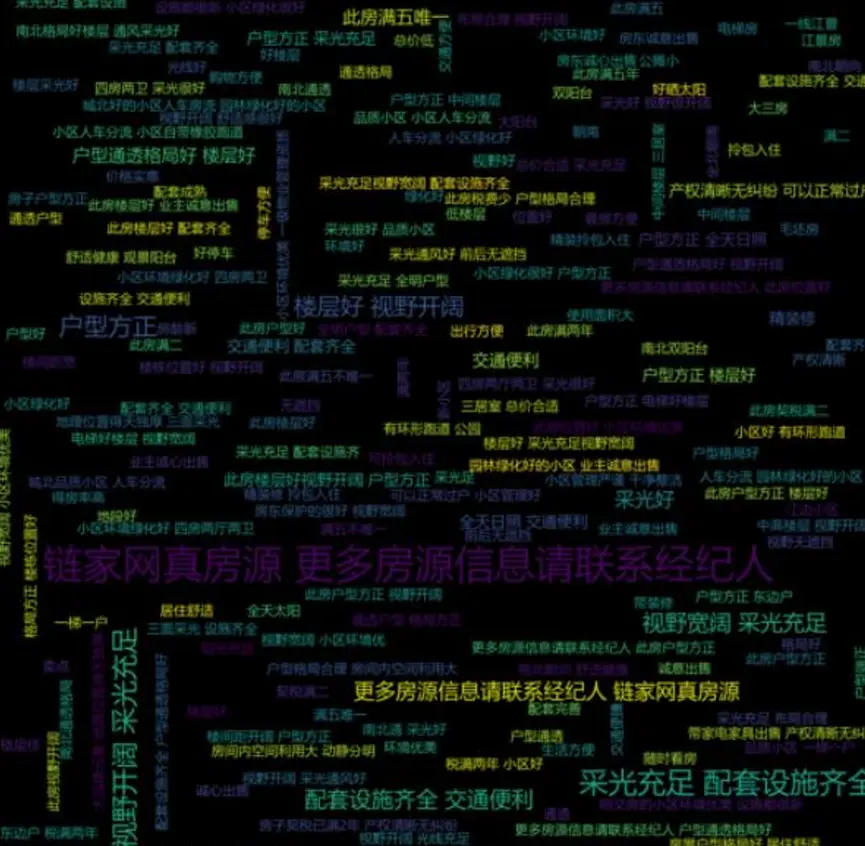 - 房源標題詞雲圖:提煉市場熱門宣傳關鍵詞,反映購房者關注焦點,詞雲圖生成代碼如下。