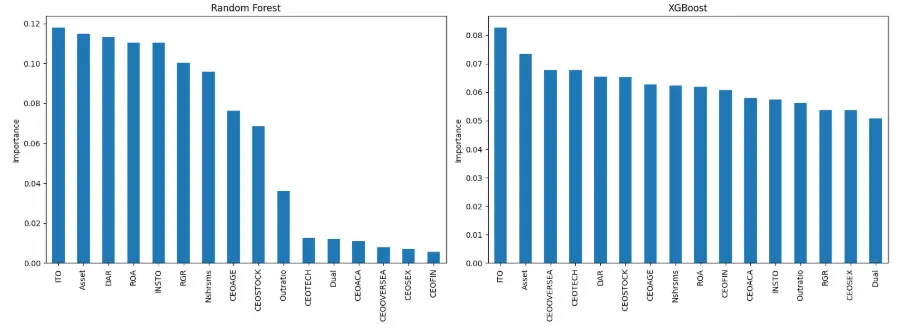 基於隨機森林與XGBoost兩種最優集成算法的特徵重要性分析顯示,存貨週轉率(ITO)在兩種算法中均排名第一,是預測研發操縱行為最強的指標;資產規模(Asset)排名第二,資產負債率(DAR)也進入前列。CEO特質中,研發背景(CEOTECH)在隨機森林中重要性較高,但在XGBoost中有所下降;CEO性別(CEOSEX)等特徵重要性普遍較低,對研發操縱的預測貢獻有限。