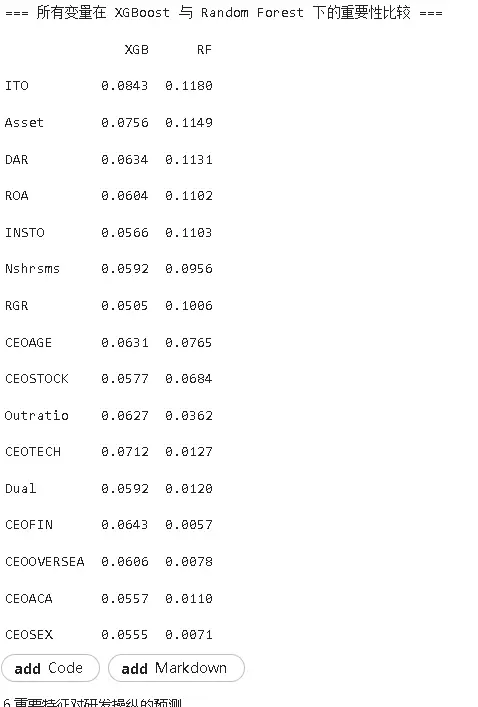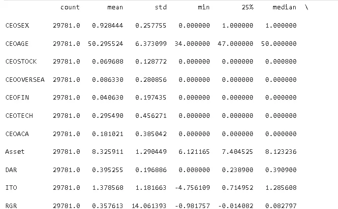 import pandas as pdimport numpy as np# 載入數據並指定編碼格式# 定義核心變量列表core_vars = [ 'CEOSEX','CEOAGE','CEOSTOCK','CEOOVERSEA','CEOFIN','CEOTECH','CEOACA', 'Asset','DAR','ITO','RGR','ROA', 'Nshrsms','Outratio','INSTO','Dual', 'RDM','RDM1']# 描述性統計分析(保留關鍵統計量)desc_stats = data[core_vars].describe(percentiles=[.25, .5, .75]).Tprint(desc_stats.round(3))# 變量分類劃分ceo_features = ['CEOSEX','CEOAGE','CEOSTOCK','CEOOVERSEA','CEOFIN','CEOTECH','CEOACA']finance_features = ['Asset','DAR','ITO','RGR','ROA']governance_features = ['Nshrsms','Outratio','INSTO','Dual']# 整合所有特徵與指定因變量all_features = finance_features + ceo_features + governance_featurestarget_var = 'RDM' # 主因變量