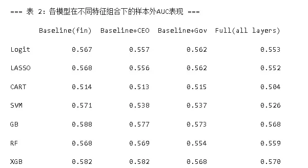 考慮到單一算法的侷限性,研究選取7種主流機器學習算法:邏輯迴歸(Logit)、LASSO迴歸、決策樹(CART)、支持向量機(SVM)、梯度提升樹(GB)、隨機森林(RF)、極端梯度提升(XGBoost)。採用時間序列交叉驗證的滾動預測方式,按“一年訓練、一年測試”的窗口進行模型訓練與評估,同時通過SMOTE技術處理類別不平衡問題。