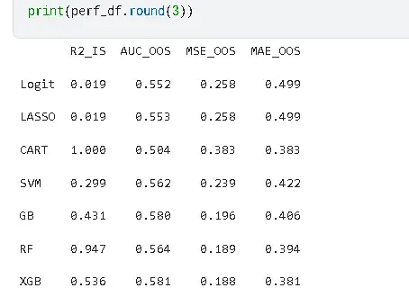 # 定義模型評估指標函數def model_metrics(model, X_train, y_train, X_test, y_test): # 訓練集與測試集預測概率 train_prob = model.predict_proba(X_train)[:,1] test_prob = model.predict_proba(X_test)[:,1] # 計算核心指標 r2_train = r2_score(y_train, train_prob) auc_test = roc_auc_score(y_test, test_prob) mse_test = mean_squared_error(y_test, test_prob) return r2_train, auc_test, mse_test# 滾動窗口評估函數def rolling_evaluation(model, X_data, y_data, n_splits=10): tscv = TimeSeriesSplit(n_splits=n_splits) metrics_dict = defaultdict(list) for train_idx, test_idx in tscv.split(X_data): # 數據劃分與標準化 X_tr, X_te = X_data.iloc[train_idx], X_data.iloc[test_idx] y_tr, y_te = y_data.iloc[train_idx], y_data.iloc[test_idx]scaler = StandardScaler().fit(X_tr) X_tr_scaled = scaler.transform(X_tr) X_te_scaled = scaler.transform(X_te)# SMOTE處理類別不平衡 X_tr_balanced, y_tr_balanced = SMOTE().fit_resample(X_tr_scaled, y_tr)# 模型訓練與指標計算 model.fit(X_tr_balanced, y_tr_balanced) r2_tr, auc_te, mse_te = model_metrics(model, X_tr_balanced, y_tr_balanced, X_te_scaled, y_te)