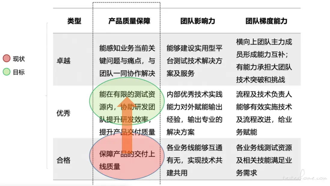 在實踐中可以通過這樣的一個目標矩陣來衡量當前團隊所處的狀態(這是一個綜合性的定性評價),當然這不是一個拍腦袋的結果,它需要有效的案例和數據支撐來説明。比如產品質量保障評估是合格,它的評估決策依據可能是這樣的情況:測試目前以功能測試為主,線上質量基本達標,自動化覆蓋低,沒有開展持續集成等。