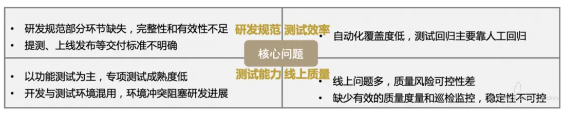 | 把握關鍵:哪些環節對實現此目標最為關鍵 | 建設統一有效的研發流程規範和交付標準,做好各個環節的質量卡點,提升交付質量 |