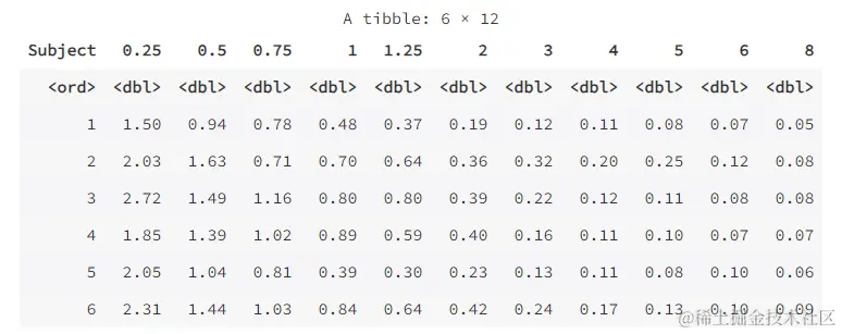 下面以 datasets 包裏的數據集 Indometh 為例進行説明。該數據集是關於藥物吲哚美辛(indometacin)的藥物代謝動力學數據,一共有 6 名試驗對象,每名試驗對象在連續的 8 小時內定時測定了血液中的藥物濃度,共有 11 次的測定值。該資料是長格式,下面將其轉換為寬格式。