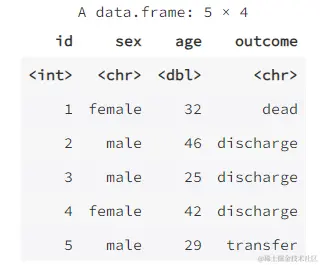 outcome = c("discharge", "dead", "discharge", "transfer", "discharge"))