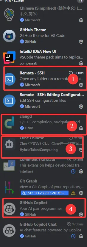 - 安裝下列插件(Cline,Copilot為AI插件,用於簡化閲讀源碼的)