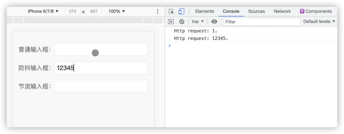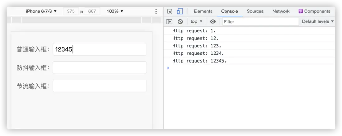 依次在對應輸入框內鍵入 12345,對比下防抖前後的結果: