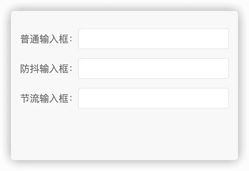 以上 Demo 只有三個輸入框,很簡單。我給每個輸入框綁定了一個 keyup 鍵盤事件,該事件執行會發起網絡請求(為了更簡潔,這裏只是打印一下而已),而對應防抖、節流輸入框則經過相應的處理。