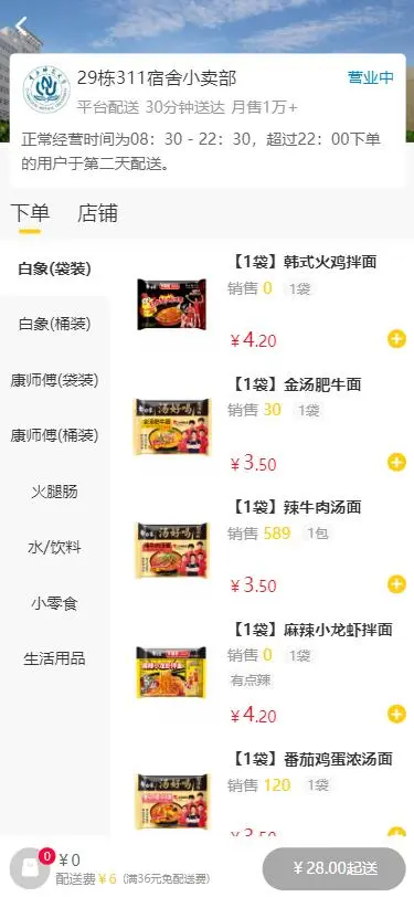例如像上面這樣的,方便麪、火腿腸、零食是大學生的最愛,你可以直接賣產品,也可以選擇附帶開水沖泡服務,至於你是賺多少錢,少賺多賺,取決於你的服務與產品質量,宿舍遠的可以適當加一點跑腿費什麼的,都是你自己可以控制的。這種小生意,耍耍玩玩的做,少則一天幾十,多則幾百都是沒有問題的。