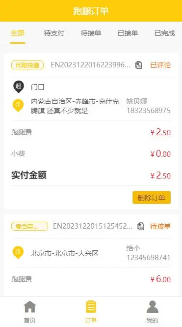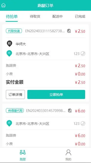 騎手申請成功後,可在騎手端進行搶單操作,可查看待搶單、待取貨、配送中、已完成等多種狀態的訂單進行操作。