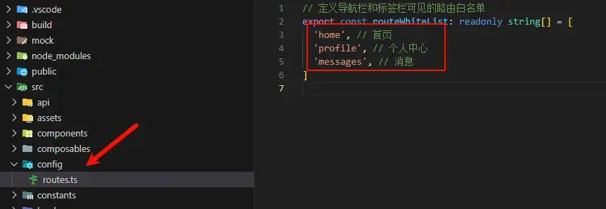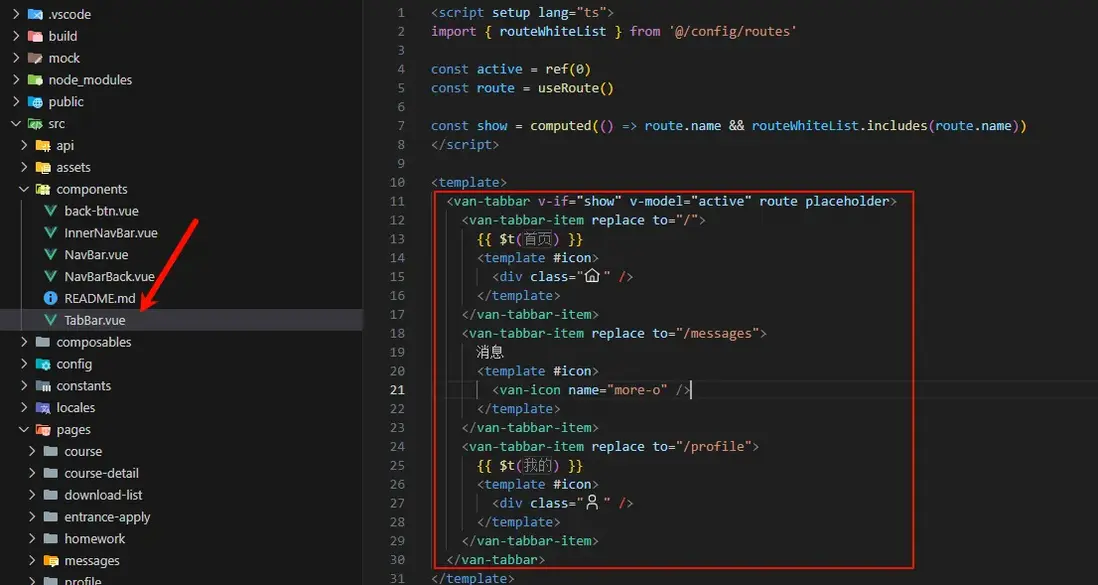 tabbar的路由對應pages下的頁面,首頁路由/直接對應index.vue,其它的就對應指定文件夾下的index.vue,比如:"/messages" 路由 對應 page/messages/index.vue