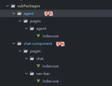這裏我樣式了一個子包中使用分包異步化,加載另一個子包組件的例子,其中subPackages/agent是一個子包,subPackages/chat-component是另一個子包,我在subPackages/agent子包的pages/agent/index頁面引入subPackages/chat-component子包內的nav-bar組件