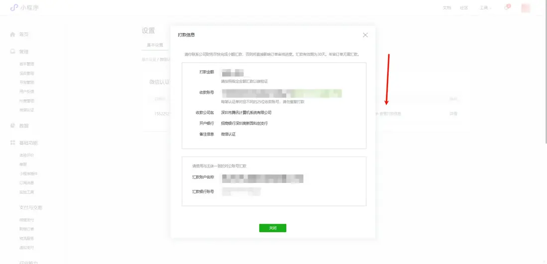 提交完材料後,這邊還要進行小額打款驗證,之後等待微信審核即可,在此期間,可能會有認證人員電話聯繫,保持電話暢通。