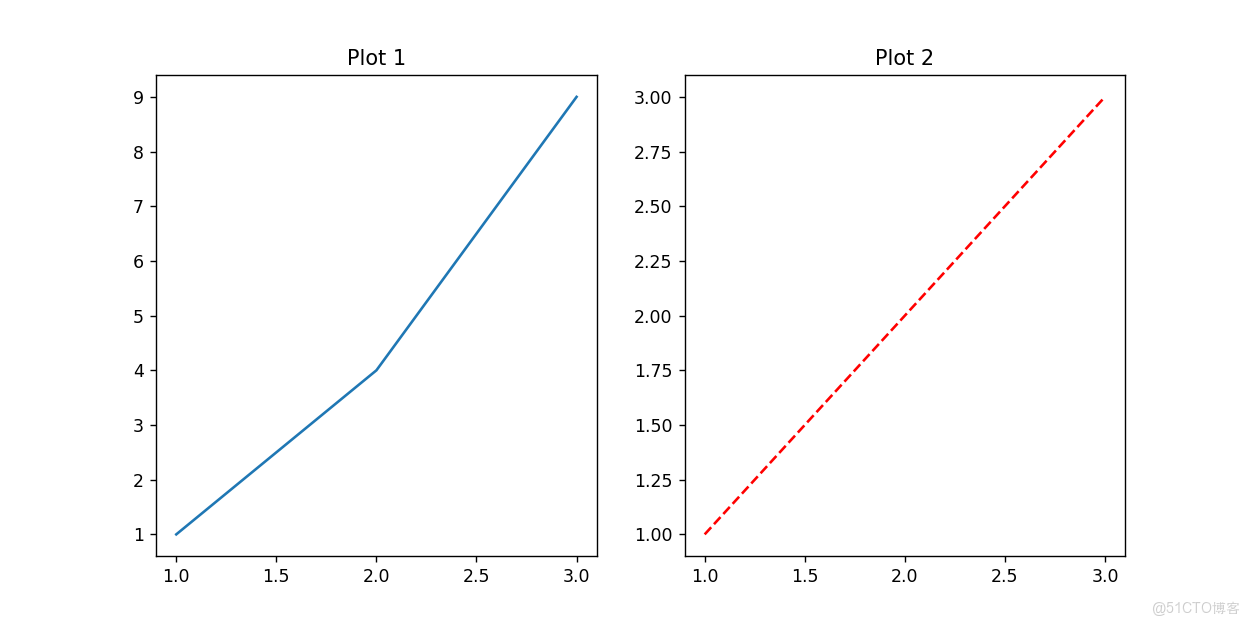 axs[1].plot([1, 2, 3], [1, 2, 3], 'r--')