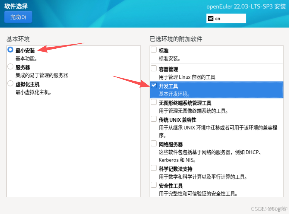 openEuler 系統安裝分為三種類型Minimal Install、Server、Virtualization Host ,使用 Minimal Install 安裝,選擇安裝"Development Tools" 組工具包