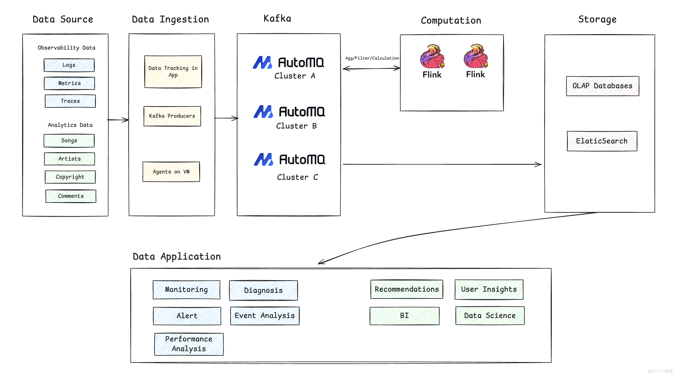 - 數據存儲 (Storage):經過實時計算處理後,數據被寫入不同的存儲系統以滿足不同的查詢需求。一部分數據會流入 OLAP 數據庫,用於後續的交互式分析和 BI 報表;另一部分數據,尤其是日誌和追蹤數據,則會被寫入 Elasticsearch,以支持快速的搜索和問題定位。