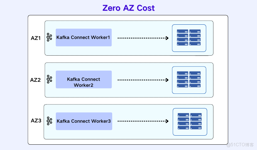 AutoMQ 通過基於 S3 的共享存儲架構,可以在服務端層面完全消除客户端寫入 AutoMQ 時的跨 AZ 流量費用。但要真正做到“端到端 Zero Cross-AZ”,通常還要求**客户端(例如 Kafka Connect Connector)**具備一定的可用區感知能力或遵循特定的路由策略。現實情況是,在傳統自建 Connector 模式下,Worker 節點往往用默認配置直接啓動,對服務端的網絡拓撲一無所知。結果就是:即便 AutoMQ 側已經為本地寫入做好了架構準備,這些“矇眼狂奔”的 Connector 仍可能把 TB 級別的 CDC 流量寫到其他 AZ 的 Broker,產生大量跨 AZ 傳輸(Regional Data Transfer)費用,把 Diskless 架構在存儲層帶來的優勢抵消掉。