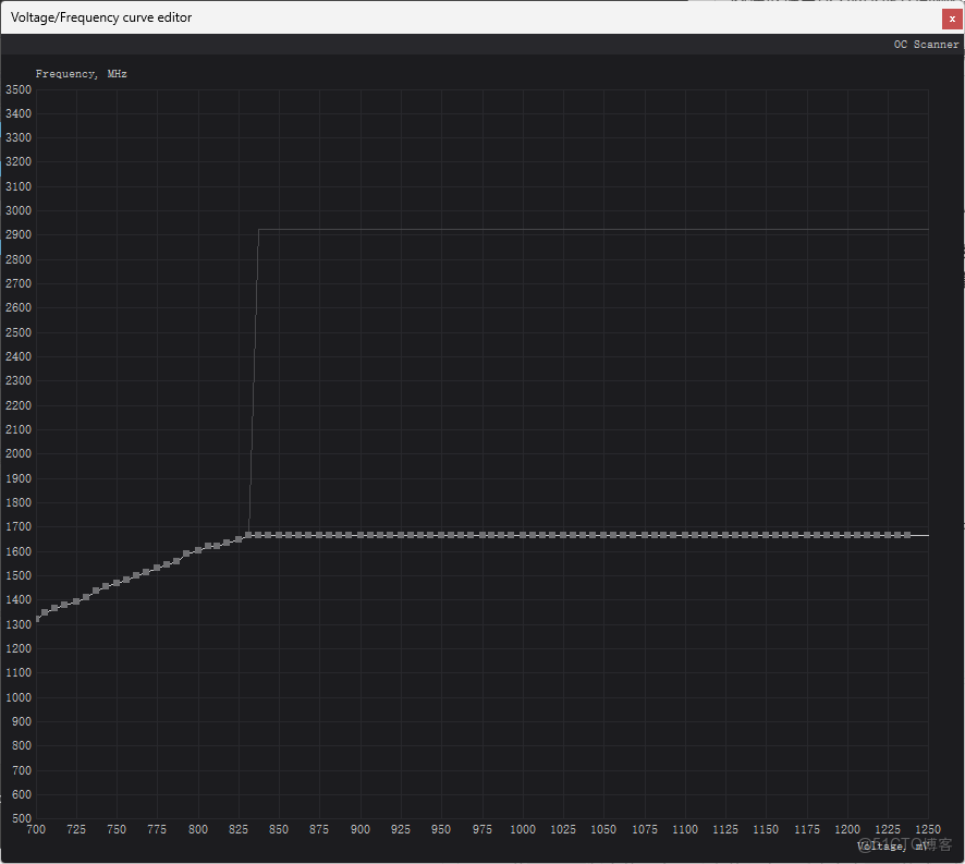 下載安裝好微星小飛機,先調節好你想要超的核心頻率和顯存頻率。一般來説顯存頻率收益不大。使用甜甜圈最大壓力烤顯卡,實時監控GPU最大頻率穩定值,把這個值作為甜點值,然後編輯電壓-頻率曲線,把高於此頻率的後面的所有點都無效即可實現降壓超頻,如下圖: