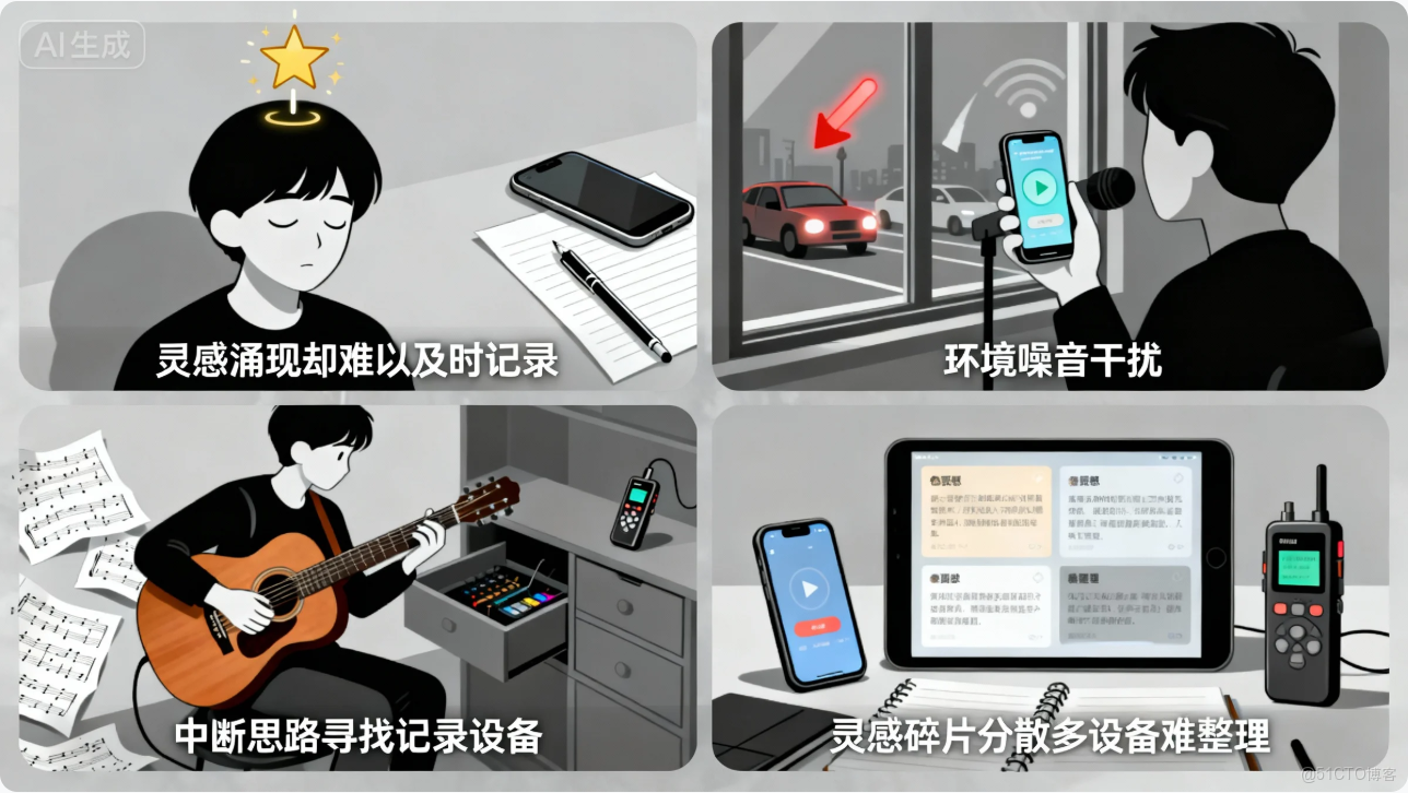 音樂創作是一個高度依賴靈感迸發的藝術過程。然而,傳統的創作方式面臨着諸多挑戰:靈感往往在不經意間涌現,卻難以及時記錄;創作者需要中斷創作思路去尋找紙筆或錄音設備;環境噪音干擾導致錄音質量不佳;靈感碎片分散在不同設備上,難以系統化整理。根據一項針對500名音樂人的調研,超過78%的創作者表示每週至少有3-5次因無法及時記錄而錯失重要靈感,這無疑是對藝術創造力的巨大浪費。