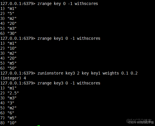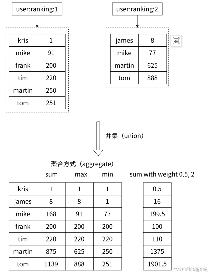 zunionstore求出給定有序集合中元素的並集並保存進⽬標有序集合中,在合併過程中以元素為單位進⾏合併,元素對應的分數按照不同的聚合⽅式和權重得到新的分數。