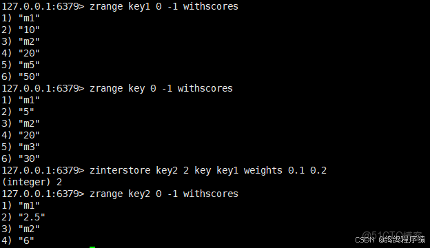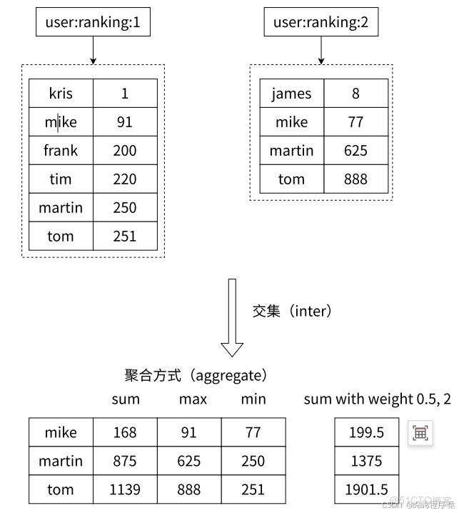 zinterstore 求出給定有序集合中元素的交集並保存進⽬標有序集合中,在合併過程中以元素為單位進⾏合併,元素對應的分數按照不同的聚合⽅式和權重得到新的分數。