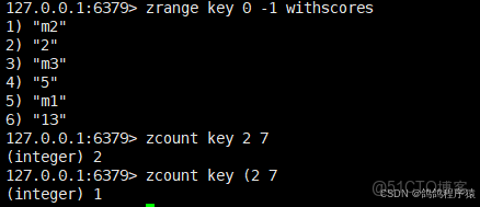 zcount返回分數在 min 和 max 之間的元素個數,默認情況下,min 和 max 都是包含的,可以通過 ( 排除。min 和 max支持浮點數,inf : 代表無窮大,-inf:代表負無窮大。