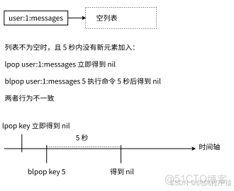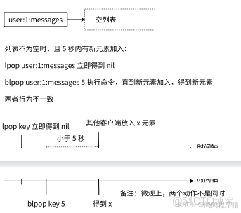 - 在列表中有元素的情況下,阻塞和⾮阻塞表現是⼀致的。但如果列表中沒有元素,⾮阻塞版本會理解返回 nil,但阻塞版本會根據 timeout,阻塞⼀段時間(可以設置等待時間 ),期間 Redis 可以執⾏其他命令(阻塞期間不會對Redis使用產生影響),但要求執⾏該命令的客⼾端會表現為阻塞狀態。