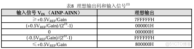 數據輸出格式 CS1237輸出的數據為24位的2進制補碼,最高位(MSB)最先輸出。最小有效位(LSB)為(0.5VREF/Gain)/(2^23-1)。正值滿幅輸出碼為7FFFFFH,負值滿幅輸出碼為800000H。下表為不同模擬輸入信號對應的理想輸出碼。 根據上表可知,不同的增益,輸入信號Vin範圍也不同。
