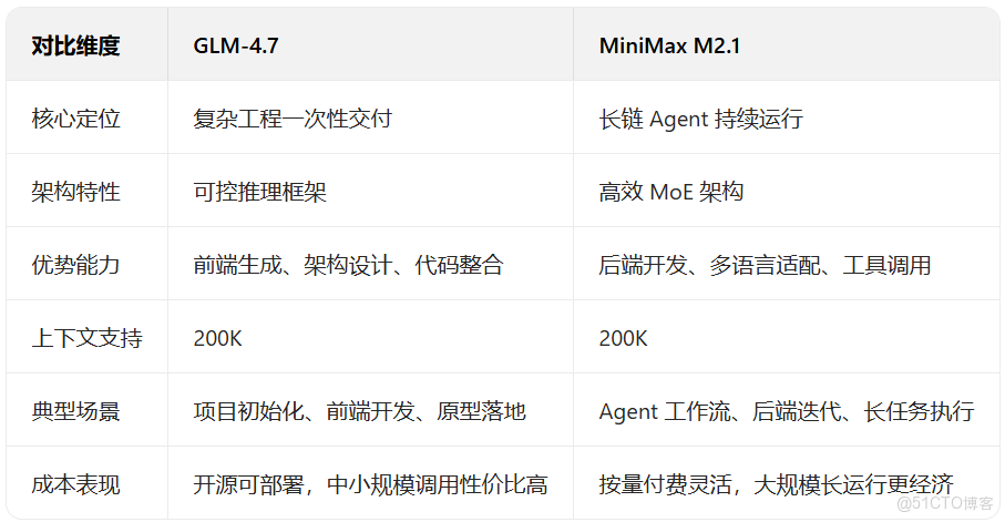 - MiniMax M2.1:側重長期穩定運行,適合長鏈Agent + 多語言後端工程。
