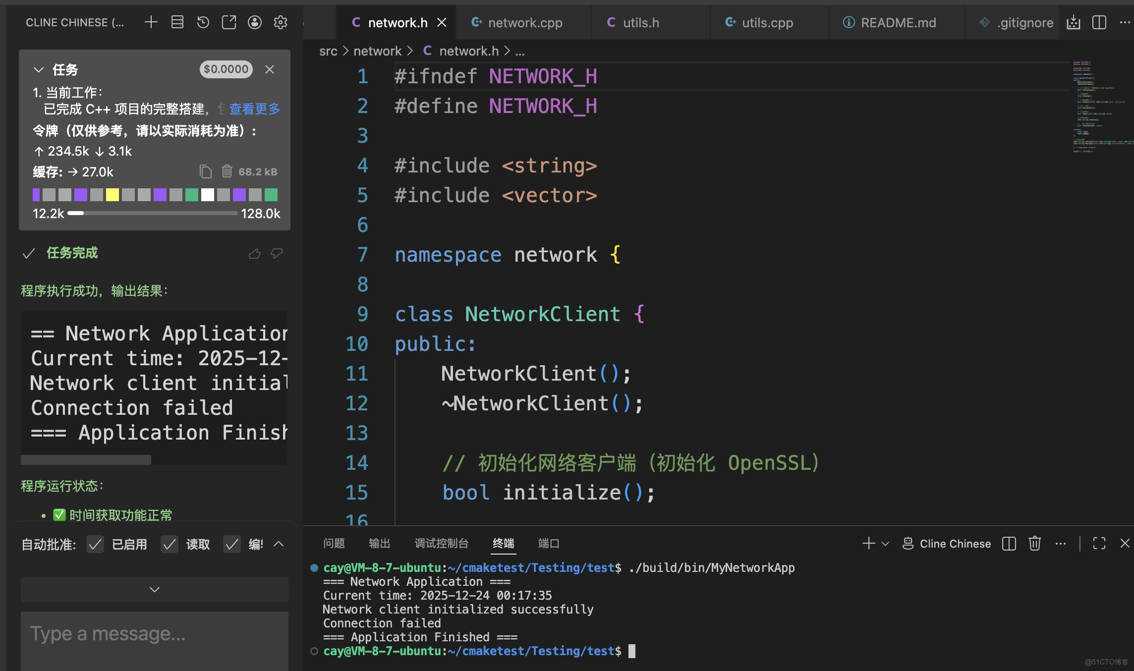 main.cpp、network.cpp/h和utils.cpp/h。目前使用 Makefile 編譯,依賴了pthread和openssl。請幫我編寫一個CMakeLists.txt,要求支持自動尋找依賴、設置 C++17 標準,併為network模塊創建一個靜態庫。請一次性提供完整的目錄結構建議和代碼。
