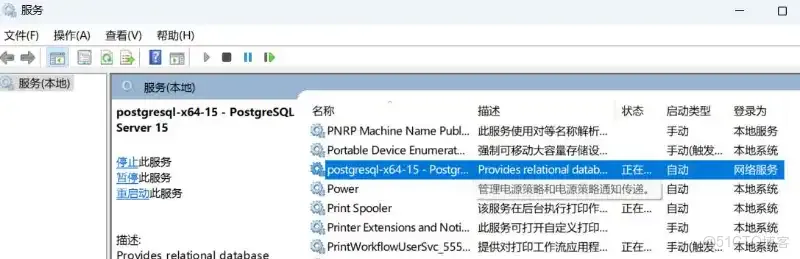 此外,如果電腦重啓後,默認情況下PostgreSQL數據庫服務應該也是默認自動啓動的;如果沒有啓動,可以在服務列表中手動將postgresql-x開頭的這個服務啓動即可;如下圖所示。