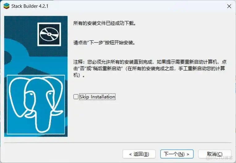 如果大家後面還需要安裝PostGIS拓展,或者是其他PostgreSQL的拓展的話,建議就勾選上圖中的勾選框。勾選之後,會在關閉PostgreSQL安裝程序後,自動打開Stack Builder窗口,如下圖所示;這個Stack Builder就是用來安裝各類PostgreSQL的拓展的。打開這個Stack Builder界面之後,先不用管他,往下繼續看本文即可。