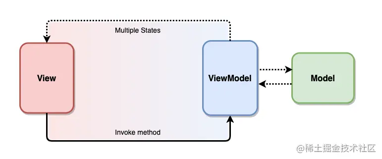 其次就是View層通過調用ViewModel層的方法來交互的,View層與ViewModel的交互比較分散,不成體系